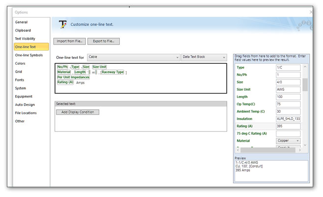 - Open an EasyPower one-line, select Tools > Options, and then select One-line Text.